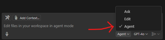 So, first check if you have the Agent Mode turn on already by looking at the list of mode you have in the the Copilot Chat.